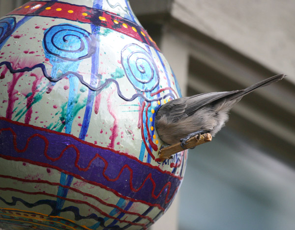 Mountain Chickadee checking out artist Carmon Slater's bird house, yard,