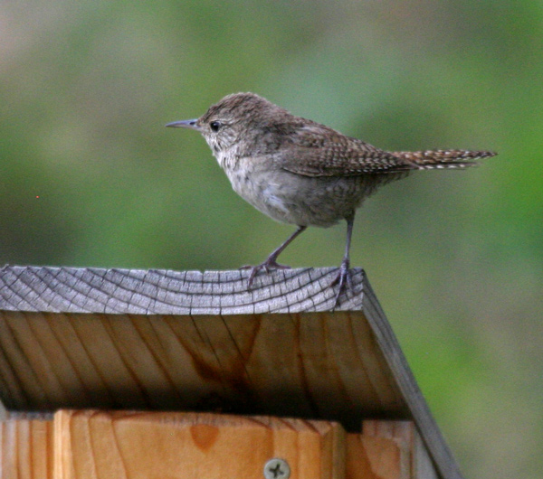 24-7728 House Wren on top of her nest box, yard in Evergreen, CO, 28 July