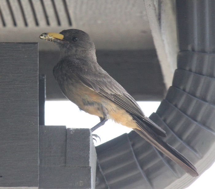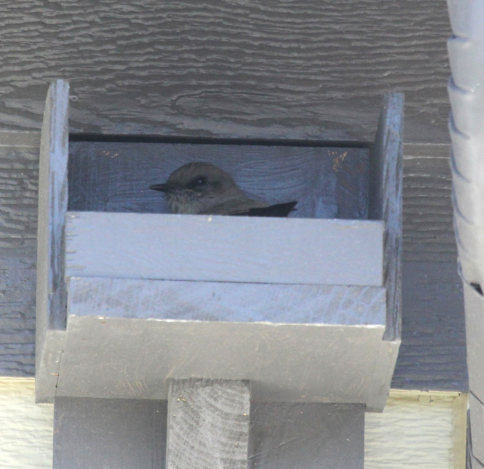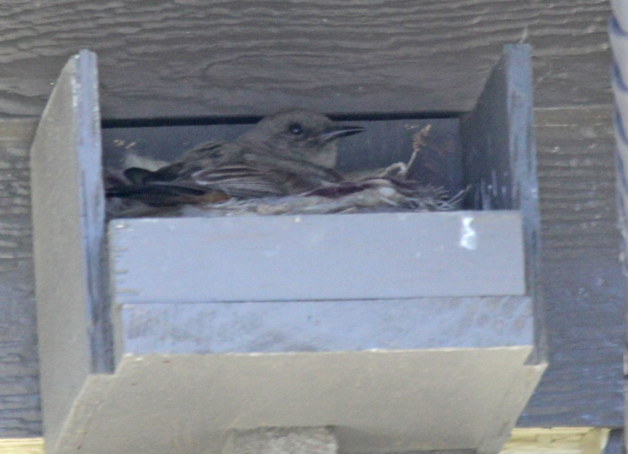 12-5711 Say's Phoebe female working on nest in box on my porch in N