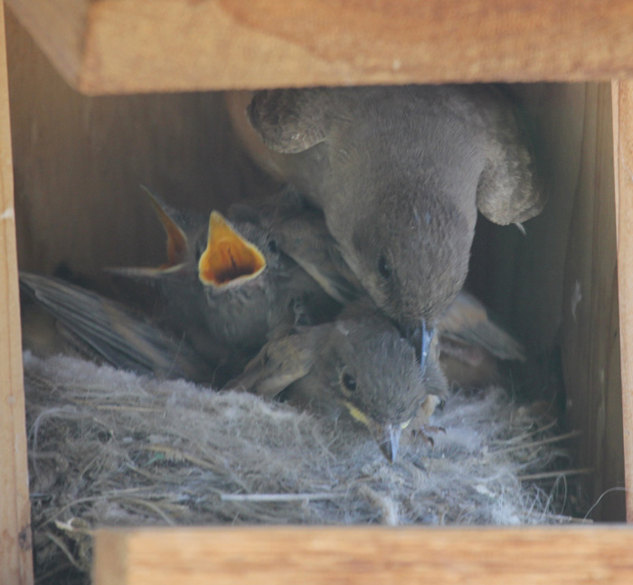 14-61914 Four (see two tails plus fem on left) Say's Phoebe nestlings in box and being fed by