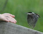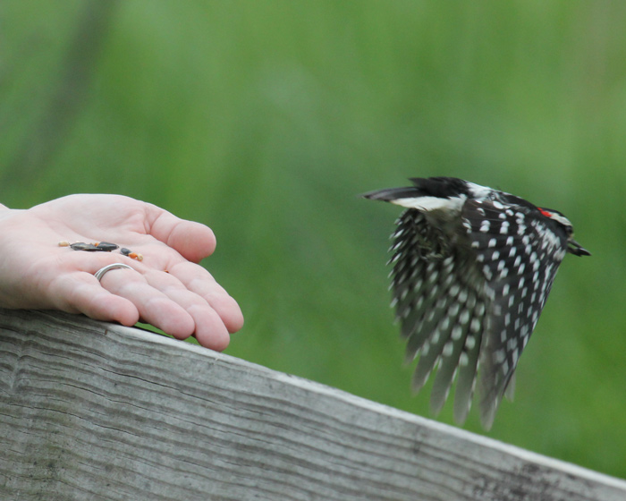 177-52811 A Downy Woodpecker comes to grab a seed from Tracy's hand,