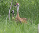 smaller birds with her iPhone, not expecting a crane family to walk up to