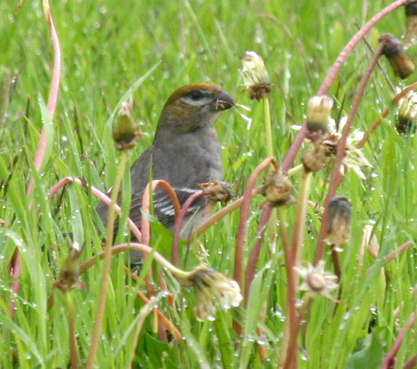Pine Grosbeak eating dandelion seeds at Saint Bride's, Newf., 5 July 2008 |