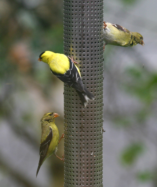 American Goldfinches on feeder at Liscombe Lodge, Liscomb, NS, 10 July