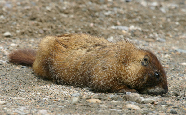 Yellow-bellied Marmot evidently licking salt on gravel road, Guanella