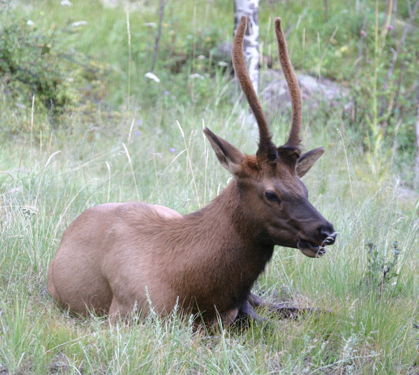 Spike bull elk chewing cud, yard, Evergreen, CO, 26 Aug 2004 |