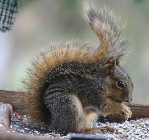 Pine Squirrel buried another peanut in sunflower seed feeder, yard,